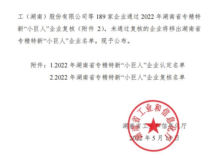 2022年5月5日湖南省工業(yè)和信息化廳公布確定湘潭華進重裝有限公司等731家企業(yè)為2022年湖南省專精特新“小巨人”企業(yè)名單的通知。根據(jù)省工信廳、省財政廳《關于印發(fā)<湖南省專精特新“小巨人”企業(yè)培育計劃(2021-2025)>的通知》(湘工信中小發(fā)展〔2021〕27號)和省工信廳《關于做好2022年湖南省專精特新“小巨人”企業(yè)培育申報和復核工作的通知》(湘工信中小發(fā)展〔2022〕60號)的要求,經(jīng)企業(yè)在線申報、市縣工信部門審核推薦、專家評審的流程來認定湖南省專精特新“小巨人”企業(yè)。