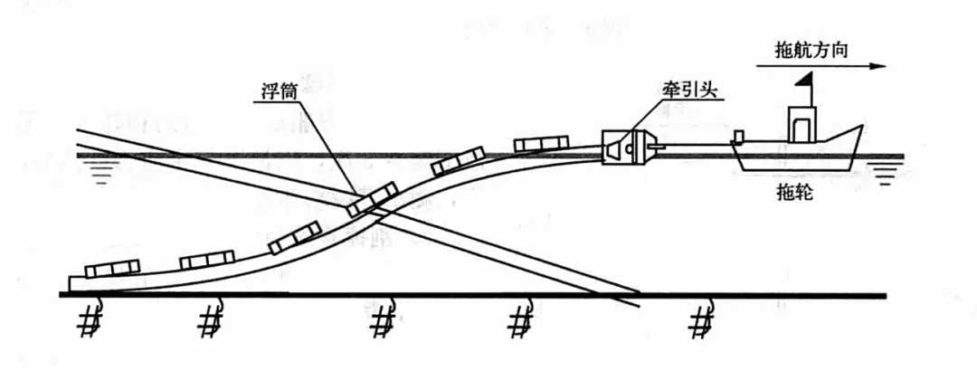 ③離底拖。離底拖指利用拖鏈和浮筒將管道懸浮在海床以上的一定高度,再由水面拖輪牽引前進(jìn),這樣避開了海底障礙和地形起伏,又減小了海面風(fēng)浪的影響,所以這種方法的適用范圍比較廣。