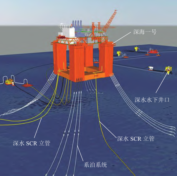 ⑸跨越期(2014年以后):中國(guó)廣泛參與國(guó)際領(lǐng)域的海底管道工程市場(chǎng)競(jìng)爭(zhēng)。建成集設(shè)計(jì)、建造、安裝、維修于一體的深水海底管道工程技術(shù)及裝備體系,持續(xù)完善中國(guó)淺水、中深水海底管道工程技術(shù)體系。全面具備1500m超深水油氣管道自主建設(shè)工程技術(shù)能力,建成“深海一號(hào)”大氣田并成功投產(chǎn)(圖6),技術(shù)及裝備能力總體達(dá)到國(guó)際先進(jìn)水平。