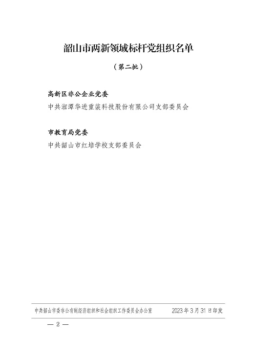 2023年3月31日,根據(jù)湘潭市委兩新工委關(guān)于全市兩新系統(tǒng)縣級(jí)標(biāo)桿黨組織創(chuàng)建工作安排,在各黨委嚴(yán)格把關(guān)、部門聯(lián)審、擇優(yōu)推薦的基礎(chǔ)上,經(jīng)綜合評(píng)審,確定中共湘潭華進(jìn)重裝科技股份有限公司支部委員會(huì)等2個(gè)基層黨組織為韶山市兩新領(lǐng)域標(biāo)桿黨組織。