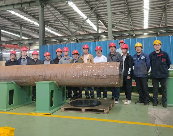 ? ? 2023年4月6-9日,中油寶世順(秦皇島)鋼管有限公司(以下簡(jiǎn)稱“寶世順公司”)擴(kuò)徑機(jī)項(xiàng)目組成員對(duì)華進(jìn)公司制作的新能源管材生產(chǎn)線全長(zhǎng)擴(kuò)徑機(jī)組進(jìn)行預(yù)驗(yàn)收。寶世順公司項(xiàng)目組一行首先對(duì)供貨設(shè)備外觀進(jìn)行查驗(yàn),其次,按照供貨明細(xì)進(jìn)行盤查清點(diǎn),最后在設(shè)備裝配現(xiàn)場(chǎng),使用該臺(tái)設(shè)備對(duì)直縫焊管(型號(hào):直徑610mm,長(zhǎng)度12.5米)進(jìn)行分步擴(kuò)徑。在預(yù)驗(yàn)收總結(jié)會(huì)上,寶世順公司項(xiàng)目組成員對(duì)華進(jìn)公司制作的設(shè)備給予高度評(píng)價(jià),最終得出結(jié)論為全長(zhǎng)擴(kuò)徑機(jī)組的外觀、性能均符合預(yù)驗(yàn)收的標(biāo)準(zhǔn)。